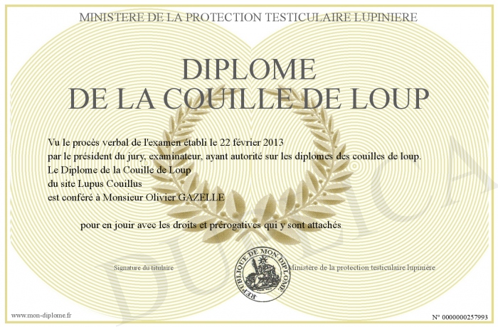 Envoyez par email votre Diplôme de la Couille de Loup personalisé