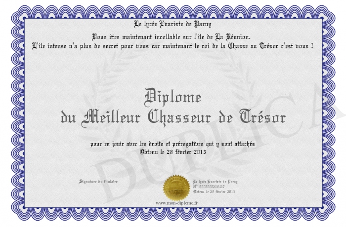 Envoyez par email votre Diplôme du Meilleur Chasseur de Trésor personalisé