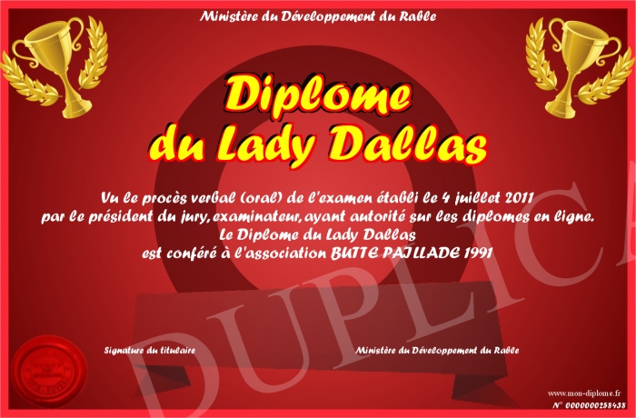 Envoyez par email votre Diplôme du Lady Dallas personalisé