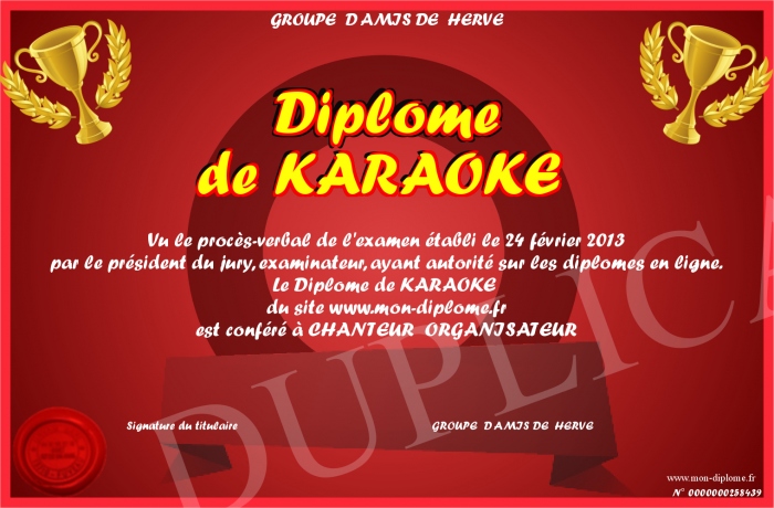 Envoyez par email votre Diplôme de KARAOKE personalisé