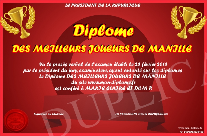 Envoyez par email votre Diplôme DES MEILLEURS JOUEURS DE MANILLE personalisé