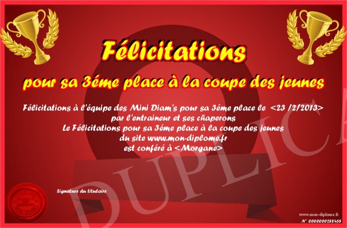 Envoyez par email votre Félicitations pour sa 3éme place à la coupe des jeunes personalisé