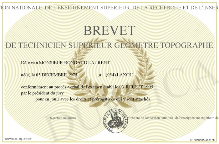 Envoyez par email votre BREVET DE TECHNICIEN SUPERIEUR géomètre topographe personalisé