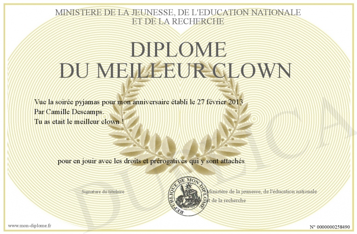 Envoyez par email votre Diplôme du meilleur clown personalisé