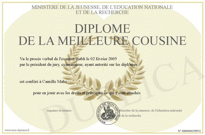 Envoyez par email votre Diplôme de la meilleure cousine personalisé