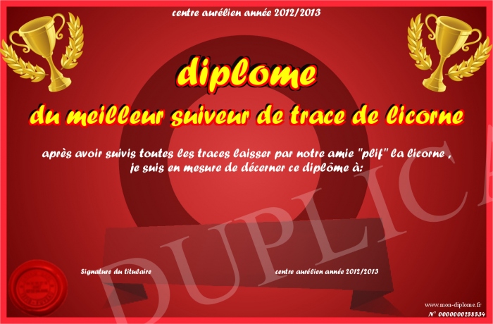 Envoyez par email votre diplome du meilleur suiveur de trace de licorne personalisé