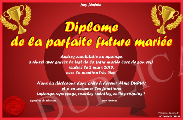 Envoyez par email votre Diplôme de la parfaite future mariée personalisé