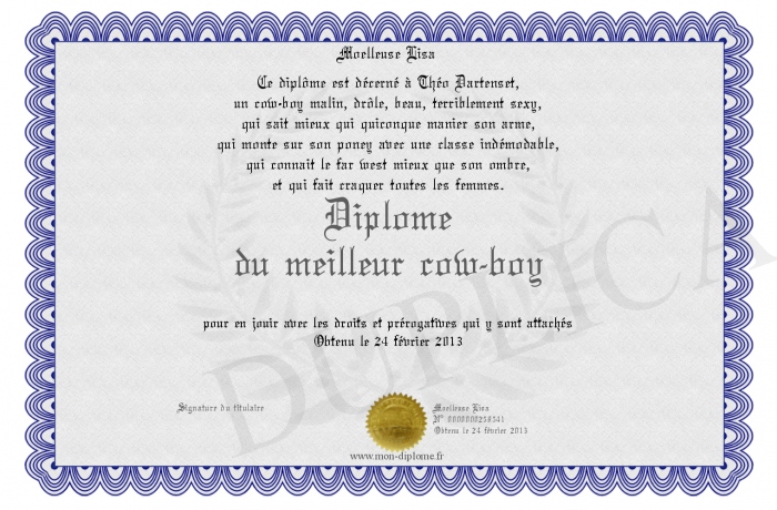 Envoyez par email votre Diplôme du meilleur cow-boy personalisé