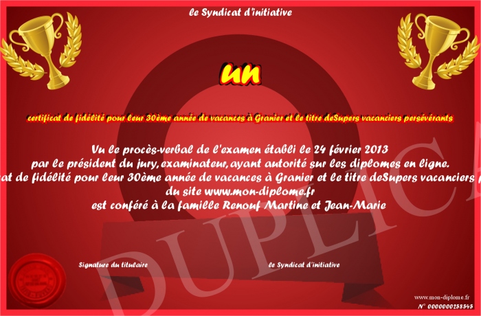 Envoyez par email votre un certificat de fidélité pour leur 30ème année de vacances à Granier et le titre deSupers vacanciers persévérants personalisé