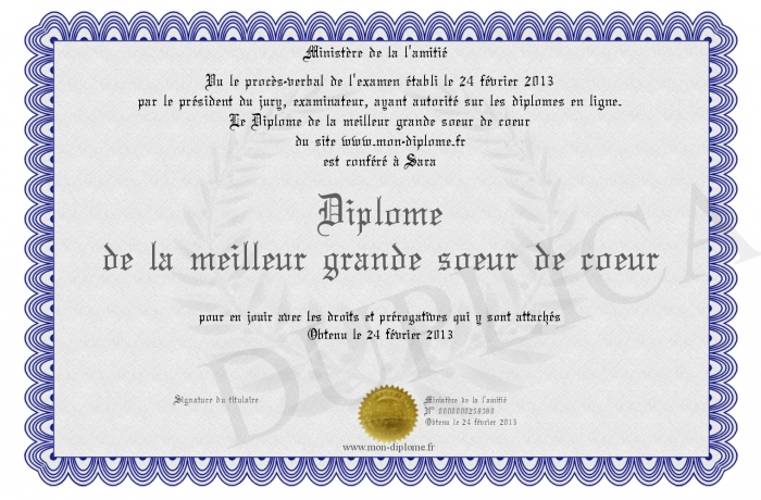 Envoyez par email votre Diplôme de la meilleur grande soeur de coeur personalisé