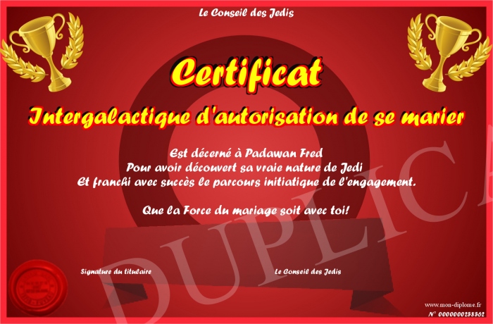 Envoyez par email votre Certificat Intergalactique d'autorisation de se marier personalisé