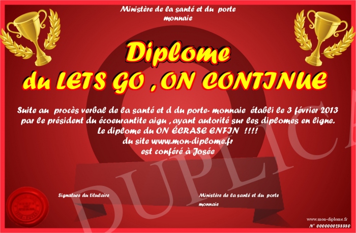 Envoyez par email votre Diplôme du LETS GO , ON CONTINUE personalisé
