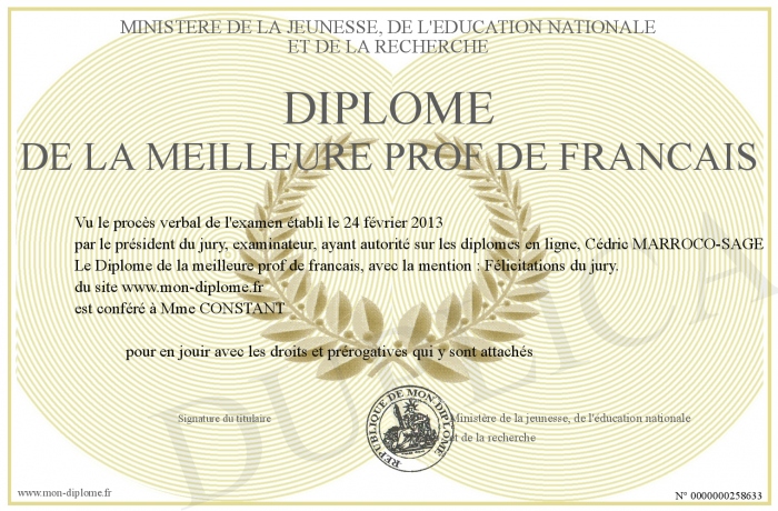 Envoyez par email votre Diplôme de la meilleure prof de francais personalisé
