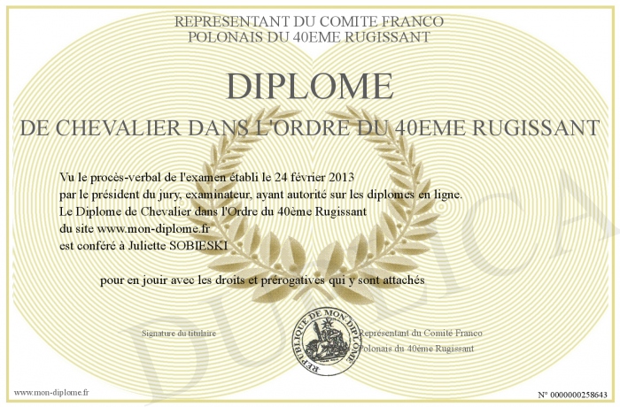 Envoyez par email votre Diplôme de Chevalier dans l'Ordre du 40ème Rugissant personalisé