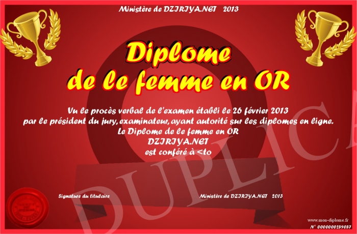 Envoyez par email votre Diplôme de le femme en OR personalisé