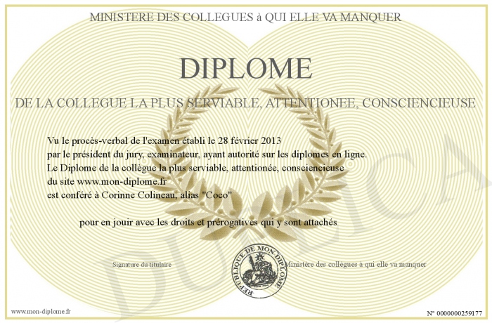 Envoyez par email votre Diplôme de la collègue la plus serviable, attentionée, consciencieuse personalisé
