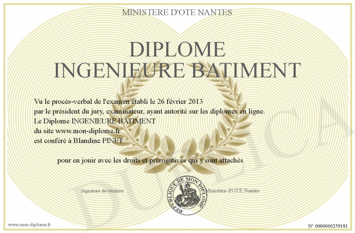 Envoyez par email votre Diplôme INGENIEURE BATIMENT personalisé