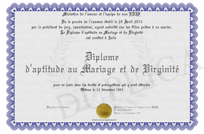 Envoyez par email votre Diplôme d'aptitude au Mariage et de Virginité personalisé