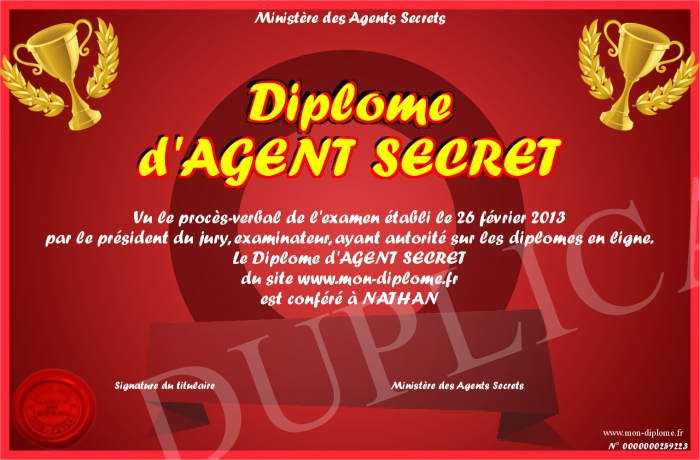 Envoyez par email votre Diplôme d'AGENT SECRET personalisé