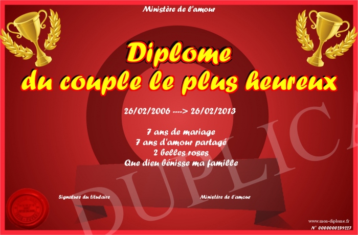 Envoyez par email votre Diplome du couple le plus heureux personalisé