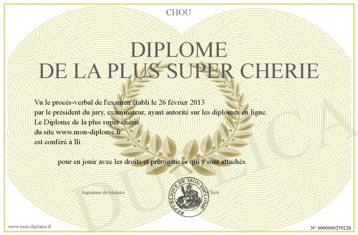 Envoyez par email votre Diplôme de la plus super chérie personalisé