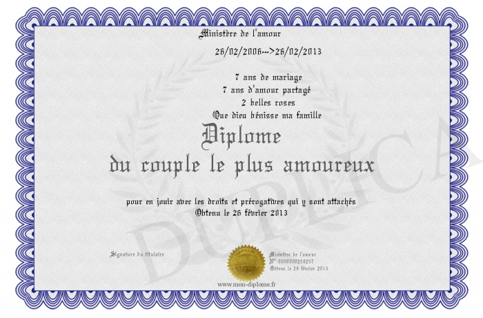 Envoyez par email votre Diplome du couple le plus amoureux personalisé