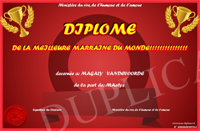Envoyez par email votre DIPLOME DE LA MEILLEURE MARRAINE DU MONDE!!!!!!!!!!!!!!! personalisé