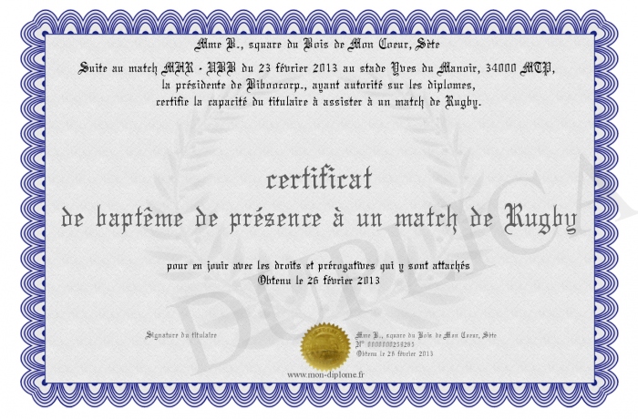 Envoyez par email votre certificat de baptême de présence à un match de Rugby personalisé