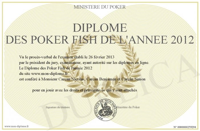 Envoyez par email votre Diplôme des Poker Fish de l'année 2012 personalisé