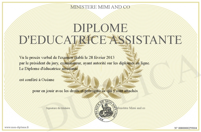 Envoyez par email votre Diplôme d'éducatrice assistante personalisé