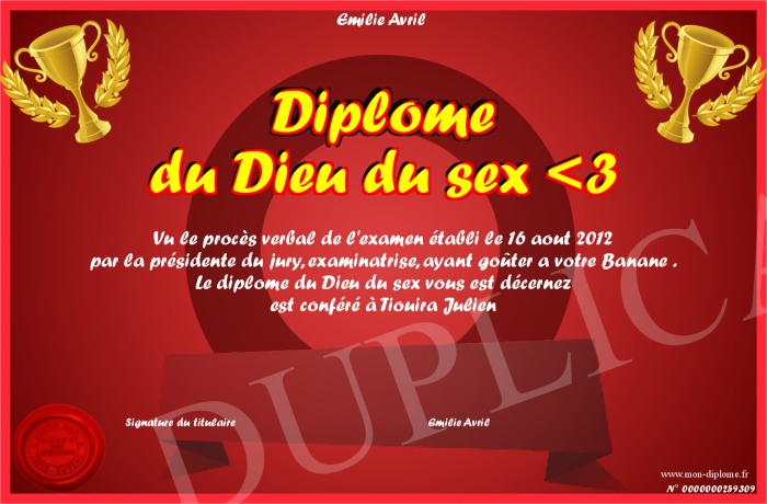 Envoyez par email votre Diplome du Dieu du sex -3 personalisé