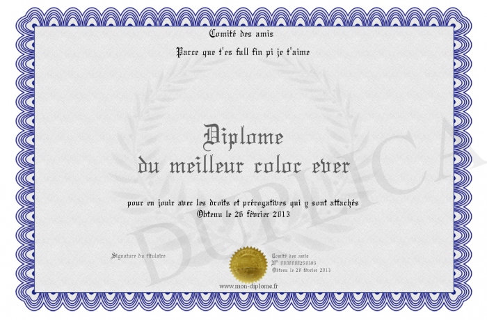 Envoyez par email votre Diplôme du meilleur coloc ever personalisé