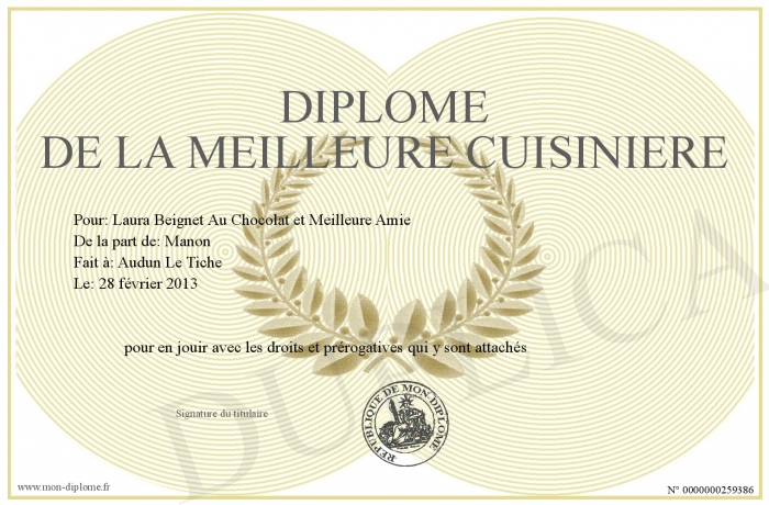 Envoyez par email votre Diplôme De La Meilleure Cuisinière personalisé