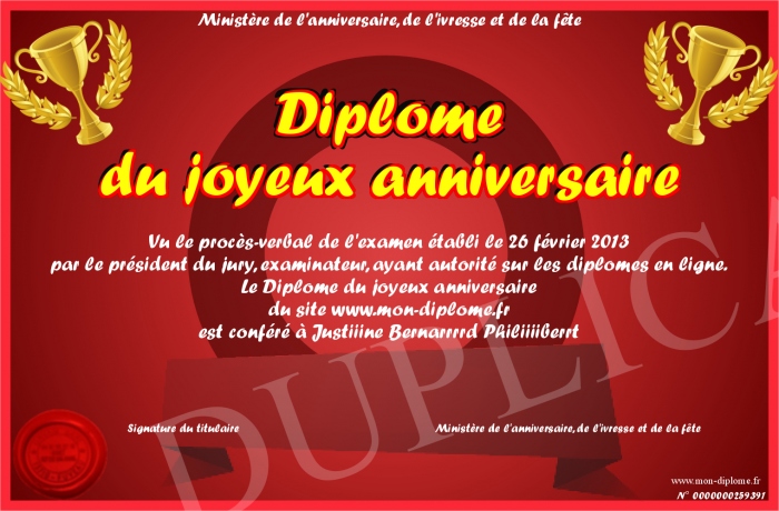 Envoyez par email votre Diplôme du joyeux anniversaire personalisé