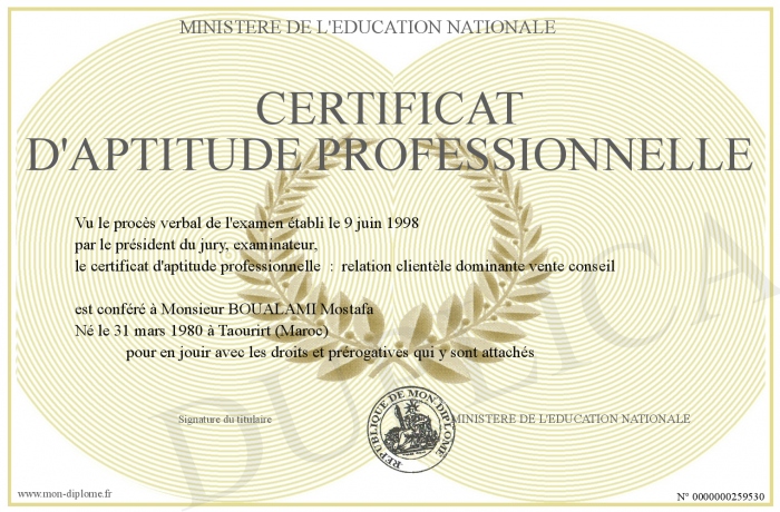 Envoyez par email votre CERTIFICAT d'APTITUDE PROFESSIONNELLE personalisé