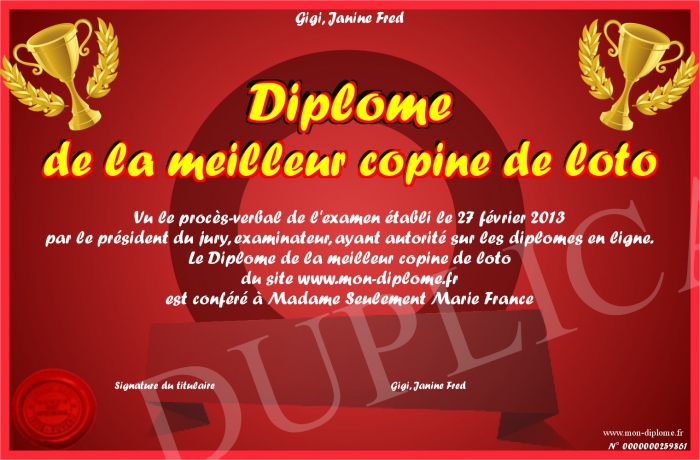 Envoyez par email votre Diplôme de la meilleur copine de loto personalisé