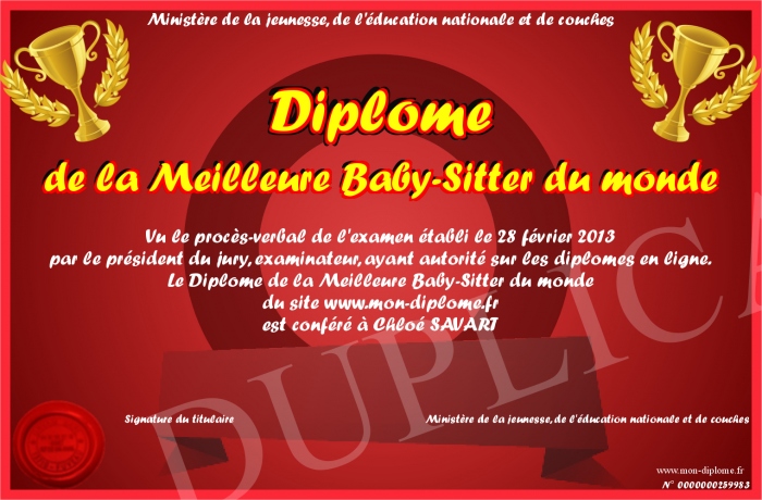 Envoyez par email votre Diplôme de la Meilleure Baby-Sitter du monde personalisé