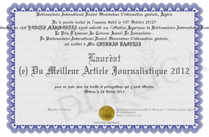 Envoyez par email votre Laurèat (e) Du Meilleur Article Journalistique 2012 personalisé