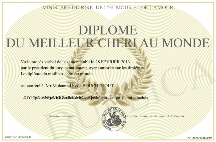 Envoyez par email votre Diplome du meilleur cheri au monde personalisé
