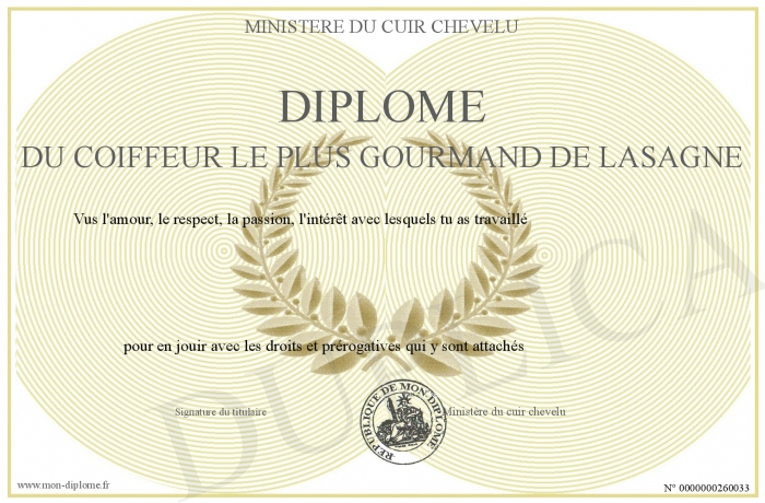 Envoyez par email votre Diplôme du coiffeur le plus gourmand de lasagne personalisé