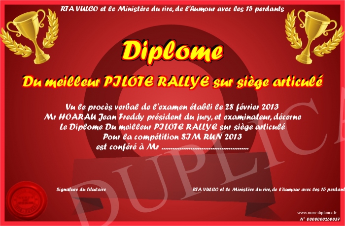 Envoyez par email votre Diplome Du meilleur PILOTE RALLYE sur siège articulé personalisé