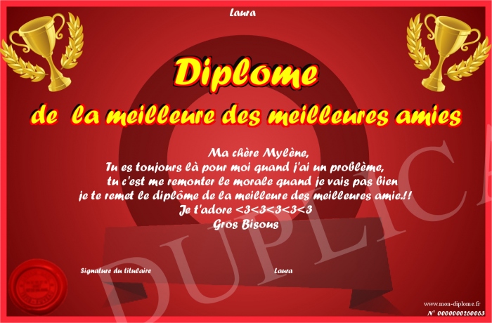 Envoyez par email votre Diplôme de la meilleure des meilleures amies personalisé