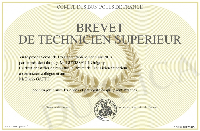 Envoyez par email votre Brevet de Technicien Supérieur personalisé