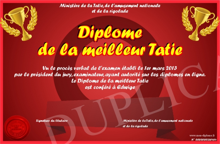 Envoyez par email votre Diplôme de la meilleur Tatie personalisé