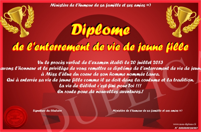 Envoyez par email votre Diplôme de l'enterrement de vie de jeune fille personalisé