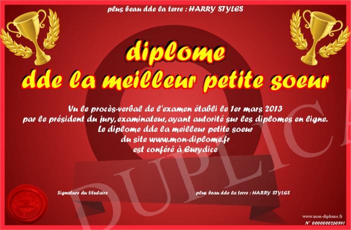 Envoyez par email votre diplôme dde la meilleur petite soeur personalisé