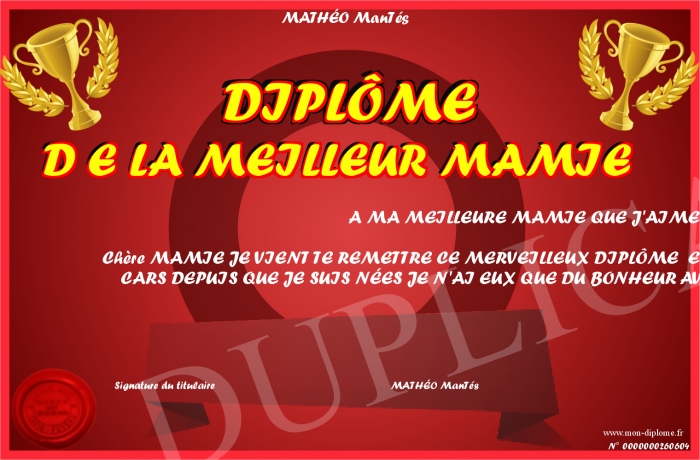 Envoyez par email votre DIPLÔME D E LA MEILLEUR MAMIE personalisé