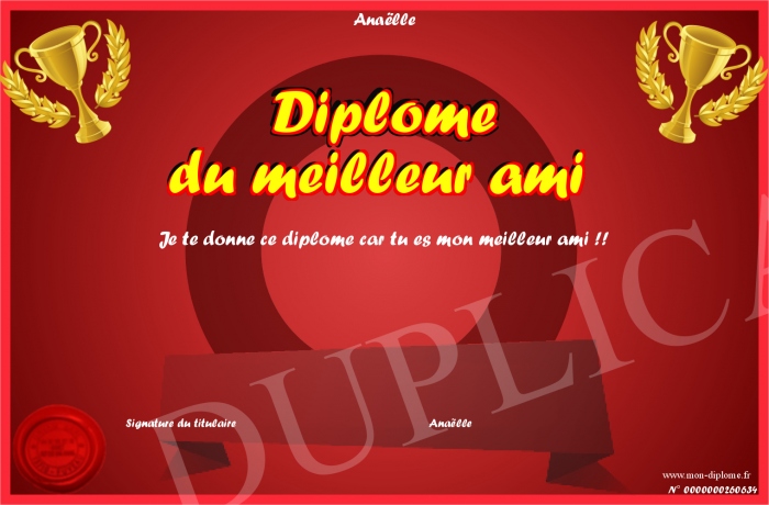 Envoyez par email votre Diplome du meilleur ami personalisé
