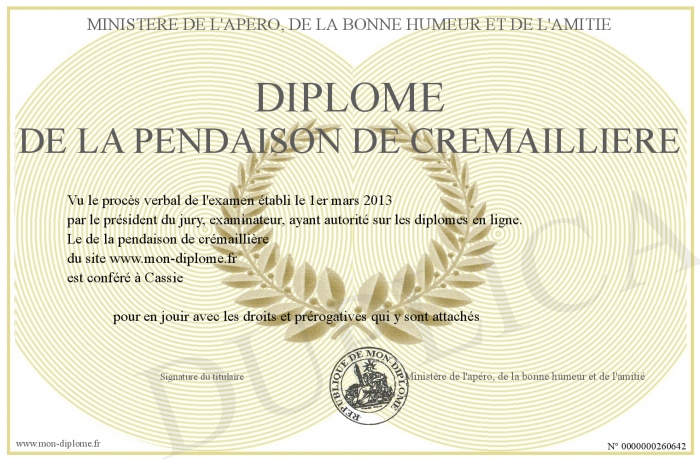 Envoyez par email votre Diplôme de la pendaison de crémaillière personalisé