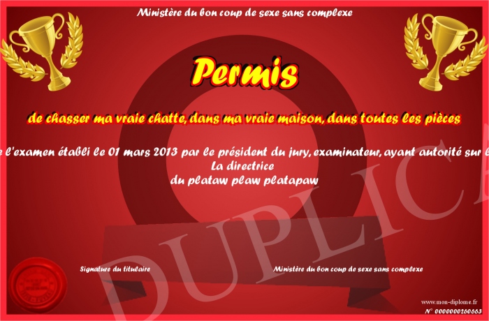 Envoyez par email votre Permis de chasser ma vraie chatte, dans ma vraie maison, dans toutes les pièces personalisé